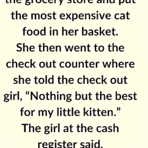 A little old lady went to the grocery store and placed the most expensive cat food in her basket. At the checkout, she cheerfully told the cashier,…