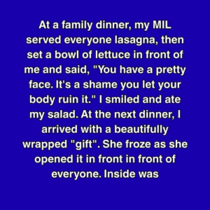At a family dinner, my MIL served everyone lasagna, then set a bowl of lettuce in front of me and said, “You have a pretty face. It’s…